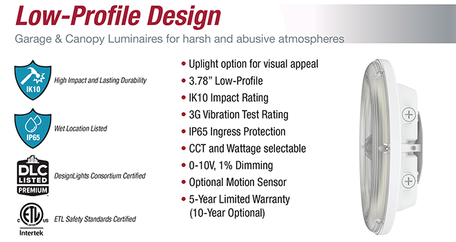 The GCL13RO Garage Lite is stylishly designed to withstand harsh conditions. Its durability, reliable performance, and long lifespan make it ideal for both indoor & outdoor parking and canopy spaces in all weather conditions. Various mounting options are available, allowing for flexible installation in many types of structures.